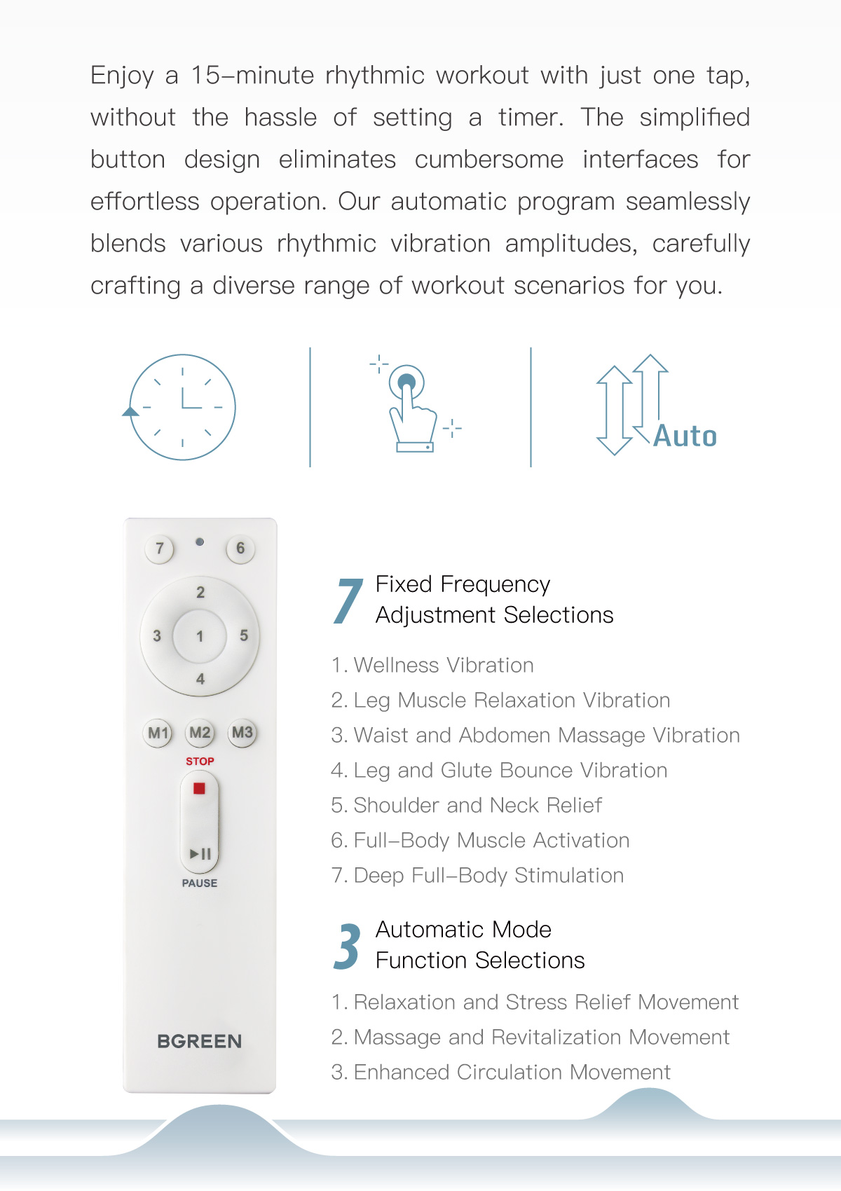 Operation Programs:7 Fixed Frequency Adjustment Selections +3 sets ofAutomatic program functions